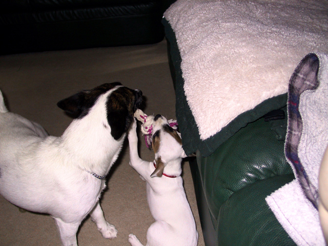 A little over a week ago, Laurie and I decided that our Jack Russell Terrier, Chipper, needed a new friend to help him out around the house. Chipper lost sight in his right eye due to glaucoma (if you have dogs or cats, please have them checked for this after age 2 and every year thereafter). Laurie started talking with folks at her office about Jack Russell Terriers. There were quite a few owners. One mentioned she knew a couple that bred them (she herself had a JRT from them) and said she thought there was a new litter available. Well, Laurie contacted them, and sure enough, they asked us to come on out and see them.
